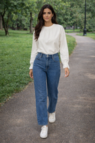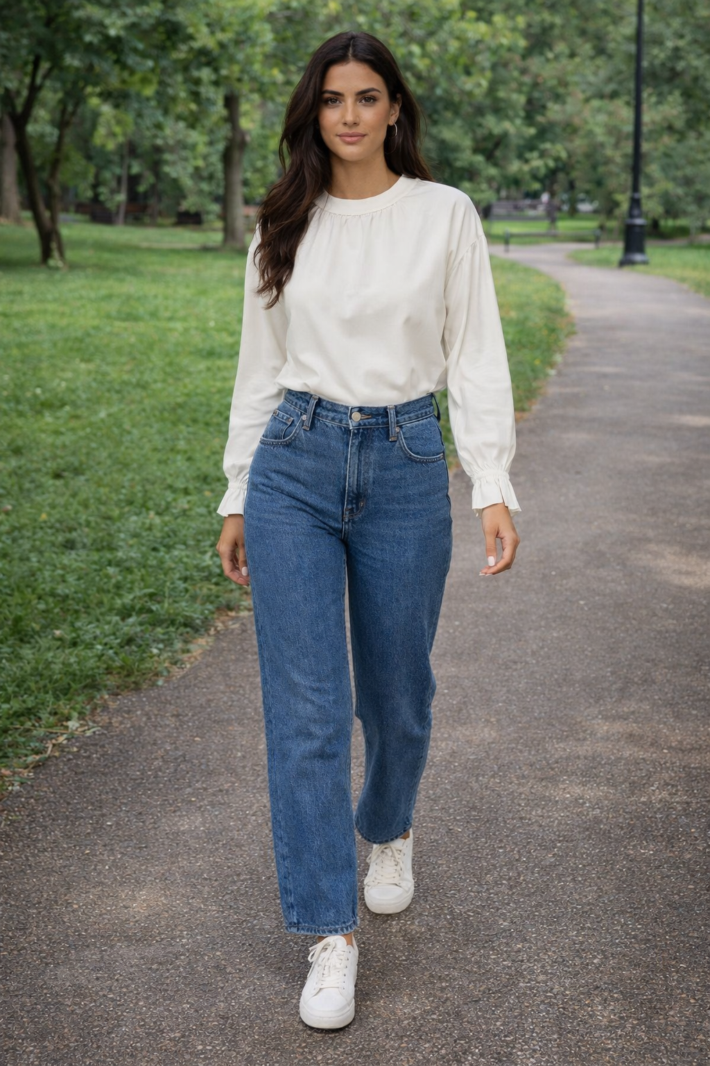 Sus mangas largas tienen volumen sutil y terminan en puños con elástico y pequeño olan, lo que le da un toque romántico y sofisticado. La parte inferior también cuenta con ajuste ligero que permite llevarla suelta o fajada sin perder forma.