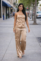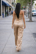 Pantalón tipo cargo del mismo material satinado, combinando funcionalidad con estilo.