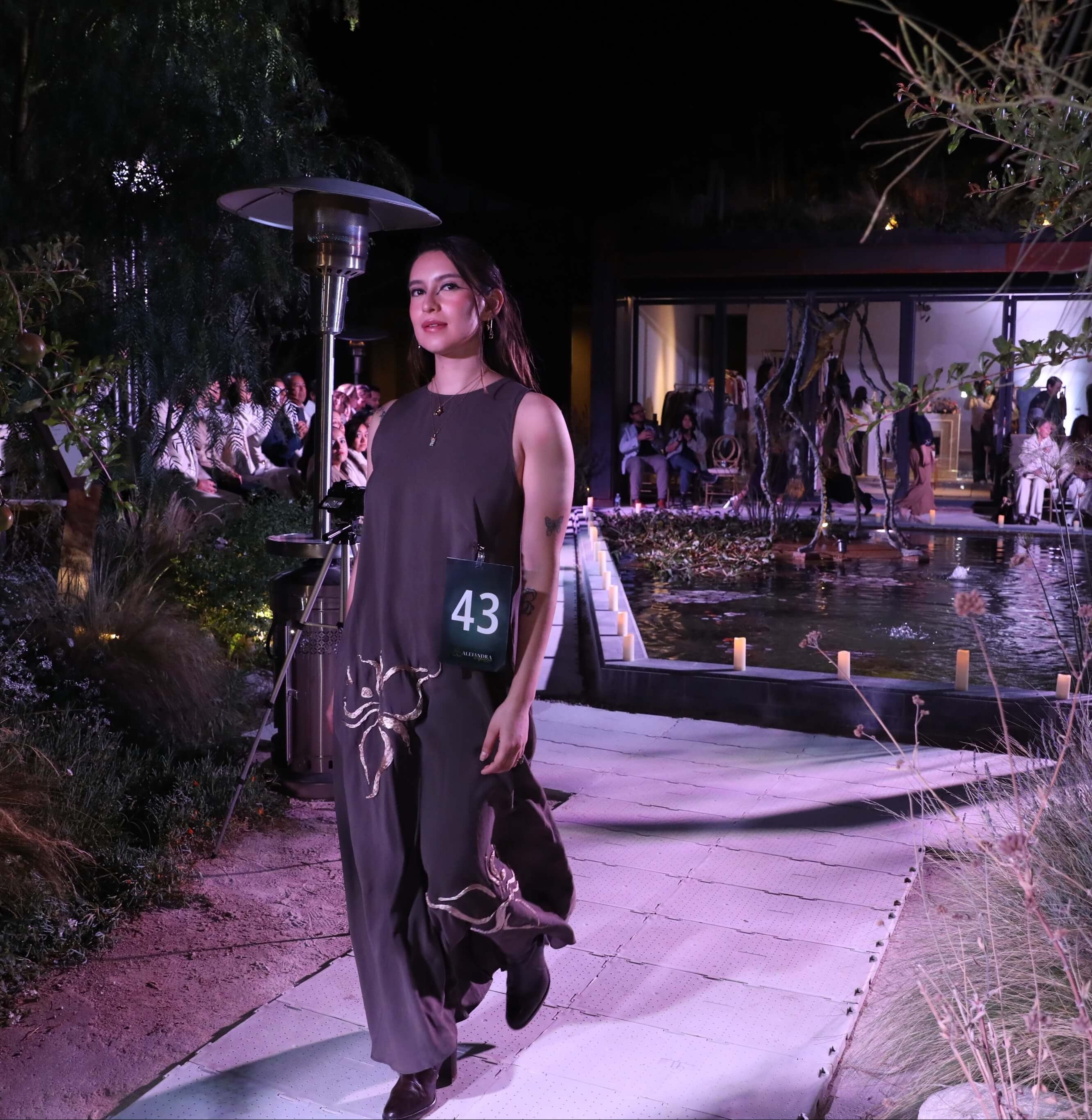 El vestido es una pieza larga y fluida en un tono café oscuro. Tiene un diseño sin mangas y un cuello redondeado, lo que le da una silueta limpia y relajada. La tela cae de manera suave desde los hombros hasta el suelo, creando un movimiento natural al caminar.