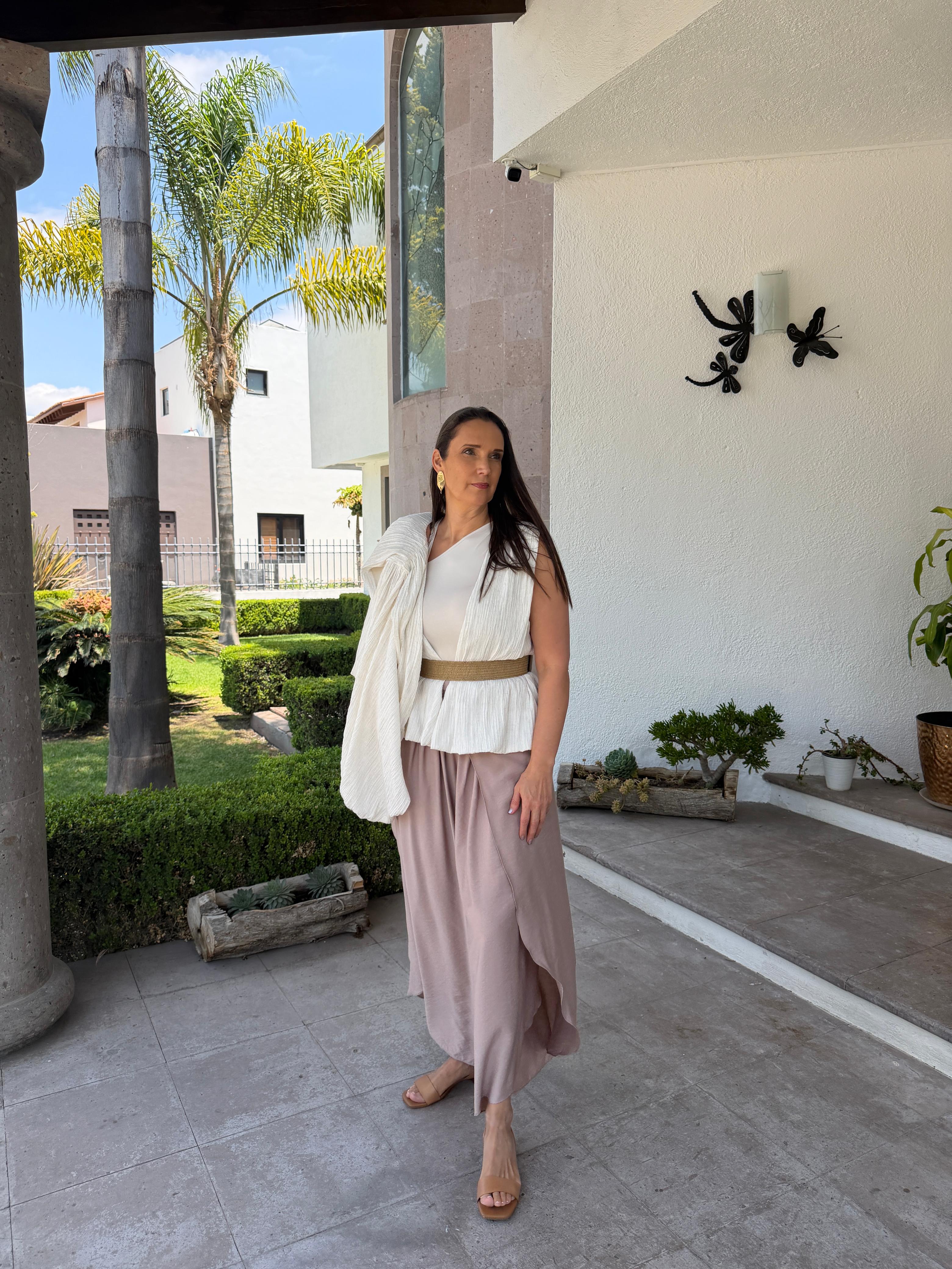 Su caída ligera y corte fluido permiten llevarlo con naturalidad, mientras que el detalle cruzado al frente crea un efecto visual elegante y distintivo. Es una prenda que transforma cualquier look en una expresión de estilo refinado y sin esfuerzo.